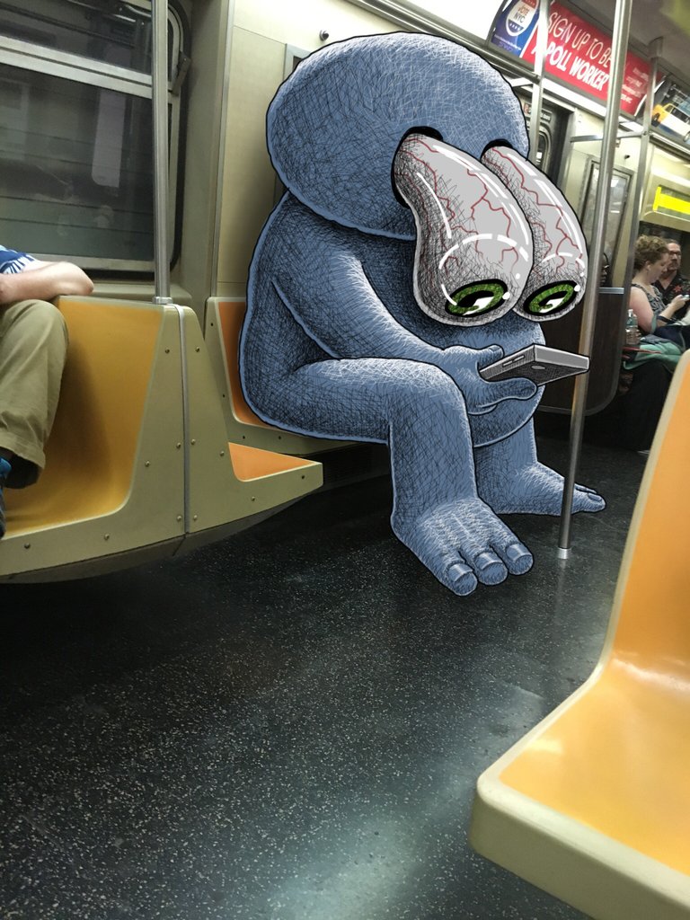 A városi élet és az ingázás ezen aspektusai jelennek meg a Subway Doodle képein, miközben a gyanútlan utasoknak fel sem tűnik, milyen szörnyek veszik őket körül, hol rájuk dőlve, vagy a könyvükbe leskelődve.